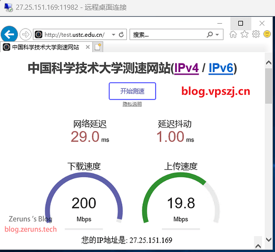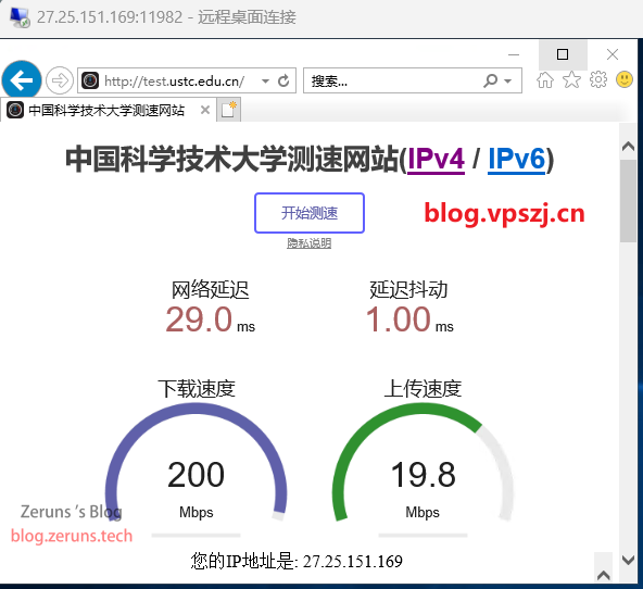 中科大测速站测得:下载速率200Mbps,上传速率19.8Mbps。
