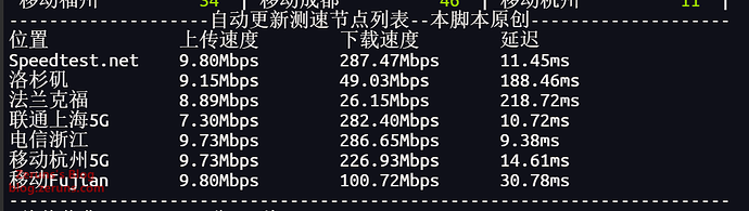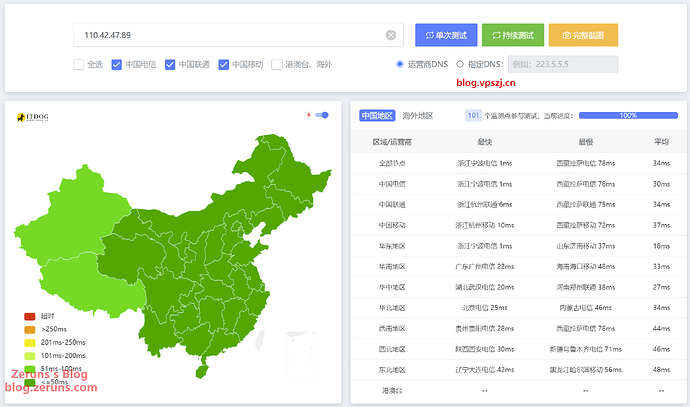 三网平均延迟 34ms,最快浙江宁波电信 1ms。