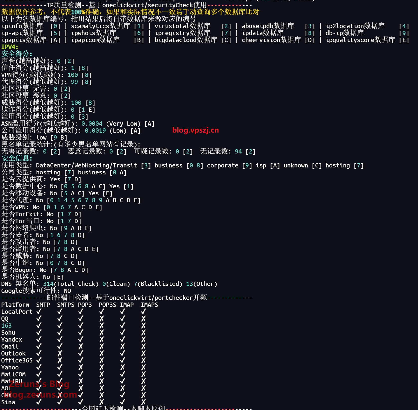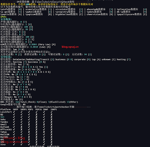 bash</s><i> </i>-------------IP质量检测--基于oneclickvirt/securityCheck使用------------- 数据仅作参考,不代表100%准确,如果和实际情况不一致请手动查询多个数据库比对 以下为各数据库编号,输出结果后将自带数据库来源对应的编号 ipinfo数据库 [0] | scamalytics数据库 [1] | virustotal数据库 [2] | abuseipdb数据库 [3] | ip2location数据库 [4] ip-api数据库 [5] | ipwhois数据库 [6] | ipregistry数据库 [7] | ipdata数据库 [8] | db-ip数据库 [9] ipapiis数据库 [A] | ipapicom数据库 [B] | bigdatacloud数据库 [C] | cheervision数据库 [D] | ipqualityscore数据库 [E] IPV4: 安全得分: 声誉(越高越好): 0 [2] 信任得分(越高越好): 1 [8] VPN得分(越低越好): 100 [8] 代理得分(越低越好): 99 [8] 社区投票-无害: 0 [2] 社区投票-恶意: 0 [2] 威胁得分(越低越好): 100 [8] 欺诈得分(越低越好): 0 [1 E] 滥用得分(越低越好): 0 [3] ASN滥用得分(越低越好): 0.0004 (Very Low) [A] 公司滥用得分(越低越好): 0.0019 (Low) [A] 威胁级别: low [9 B] 黑名单记录统计:(有多少黑名单网站有记录): 无害记录数: 0 [2] 恶意记录数: 0 [2] 可疑记录数: 0 [2] 无记录数: 94 [2] 安全信息: 使用类型: DataCenter/WebHosting/Transit [3] business [0 8] corporate [9] isp [A] unknown [C] hosting [7] 公司类型: hosting [7] business [0 A] 是否云提供商: Yes [7 D] 是否数据中心: No [0 5 6 8 A C] Yes [1] 是否移动设备: No [5 A C] Yes [E] 是否代理: No [0 1 4 5 6 7 8 9 A B C D E] 是否VPN: No [0 1 6 7 A C D E] 是否TorExit: No [1 7 D] 是否Tor出口: No [1 7 D] 是否网络爬虫: No [9 A B E] 是否匿名: No [1 6 7 8 D] 是否攻击者: No [7 8 D] 是否滥用者: No [7 8 A C D E] 是否威胁: No [7 8 C D] 是否中继: No [0 7 8 C D] 是否Bogon: No [7 8 A C D] 是否机器人: No [E] DNS-黑名单: 314(Total_Check) 0(Clean) 7(Blacklisted) 13(Other) Google搜索可行性:NO -------------邮件端口检测--基于oneclickvirt/portchecker开源------------- Platform SMTP SMTPS POP3 POP3S IMAP IMAPS LocalPort ✔ ✔ ✔ ✔ ✔ ✔ QQ ✔ ✔ ✔ ✘ ✔ ✘ 163 ✔ ✔ ✔ ✘ ✔ ✘ Sohu ✔ ✔ ✔ ✘ ✔ ✘ Yandex ✔ ✔ ✔ ✘ ✔ ✘ Gmail ✔ ✔ ✘ ✘ ✘ ✘ Outlook ✔ ✘ ✔ ✘ ✔ ✘ Office365 ✔ ✘ ✔ ✘ ✔ ✘ Yahoo ✔ ✔ ✘ ✘ ✘ ✘ MailCOM ✔ ✔ ✔ ✘ ✔ ✘ MailRU ✔ ✔ ✘ ✘ ✔ ✘ AOL ✔ ✔ ✘ ✘ ✘ ✘ GMX ✔ ✘ ✔ ✘ ✔ ✘ Sina ✔ ✔ ✔ ✘ ✔ ✘<i> </i><e>