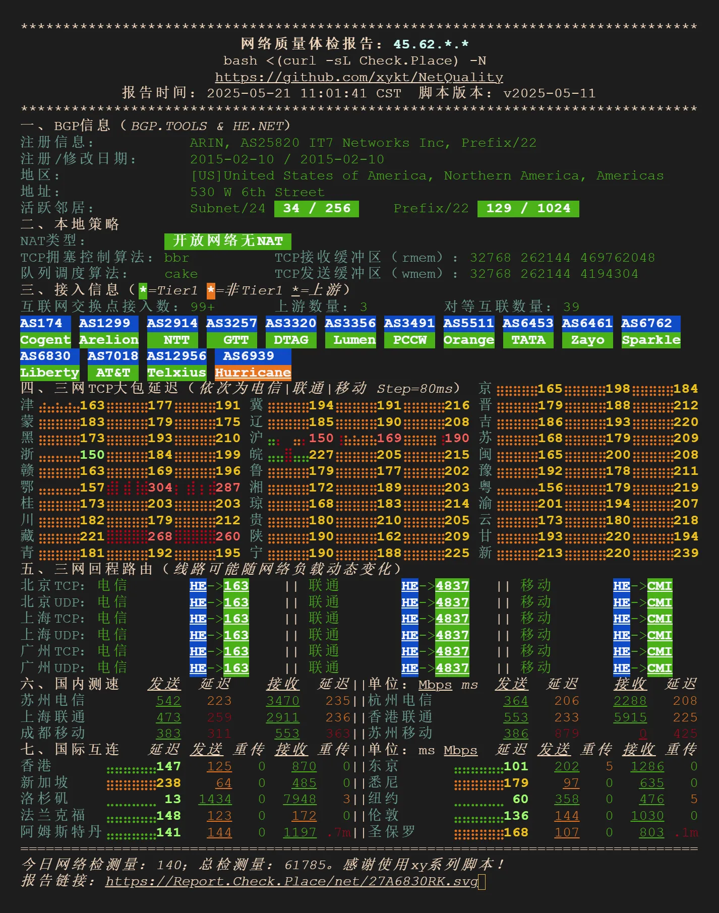 线路:普通线路,非优化。HE (Hurricane Electric) 对等连接。