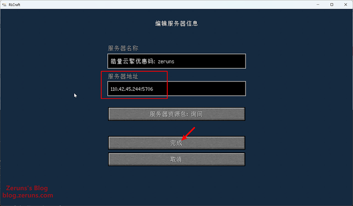 打开整合包客户端(上面下载链接可以下载),然后点击多人游戏→添加服务器,输入你服务器的IP地址和端口,点击完成,然后点击加入服务器。