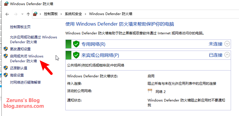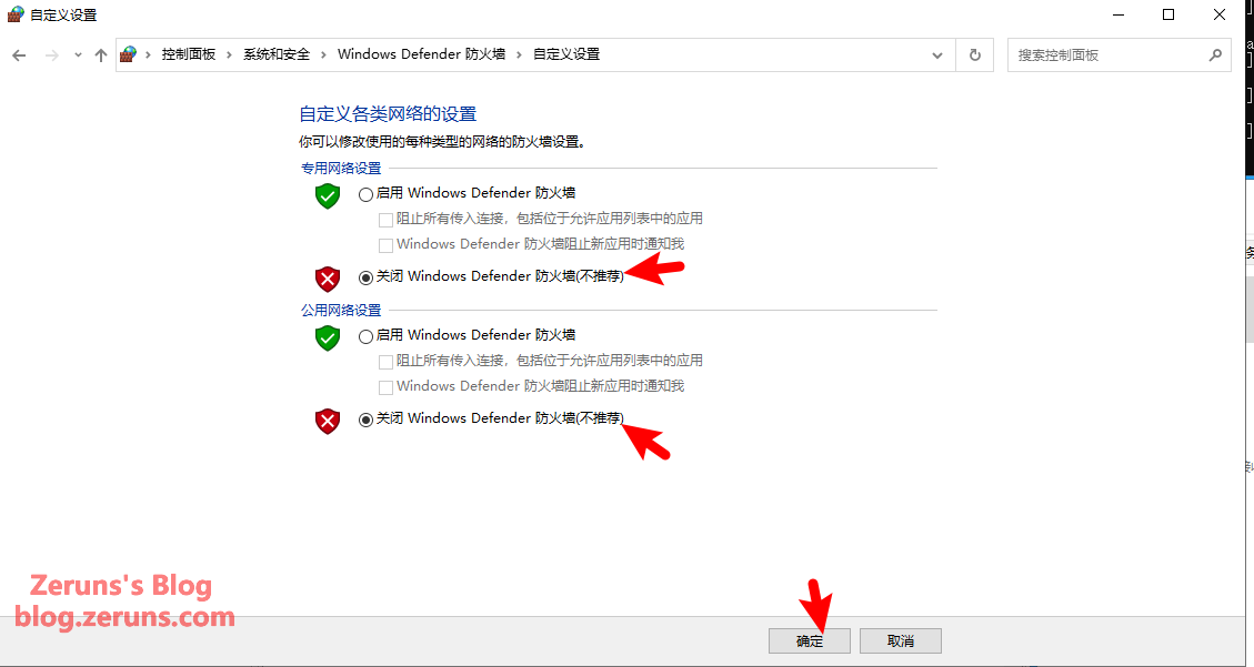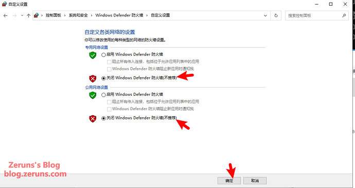 勾选 关闭 Windows Defender 防火墙 ,然后点击确定