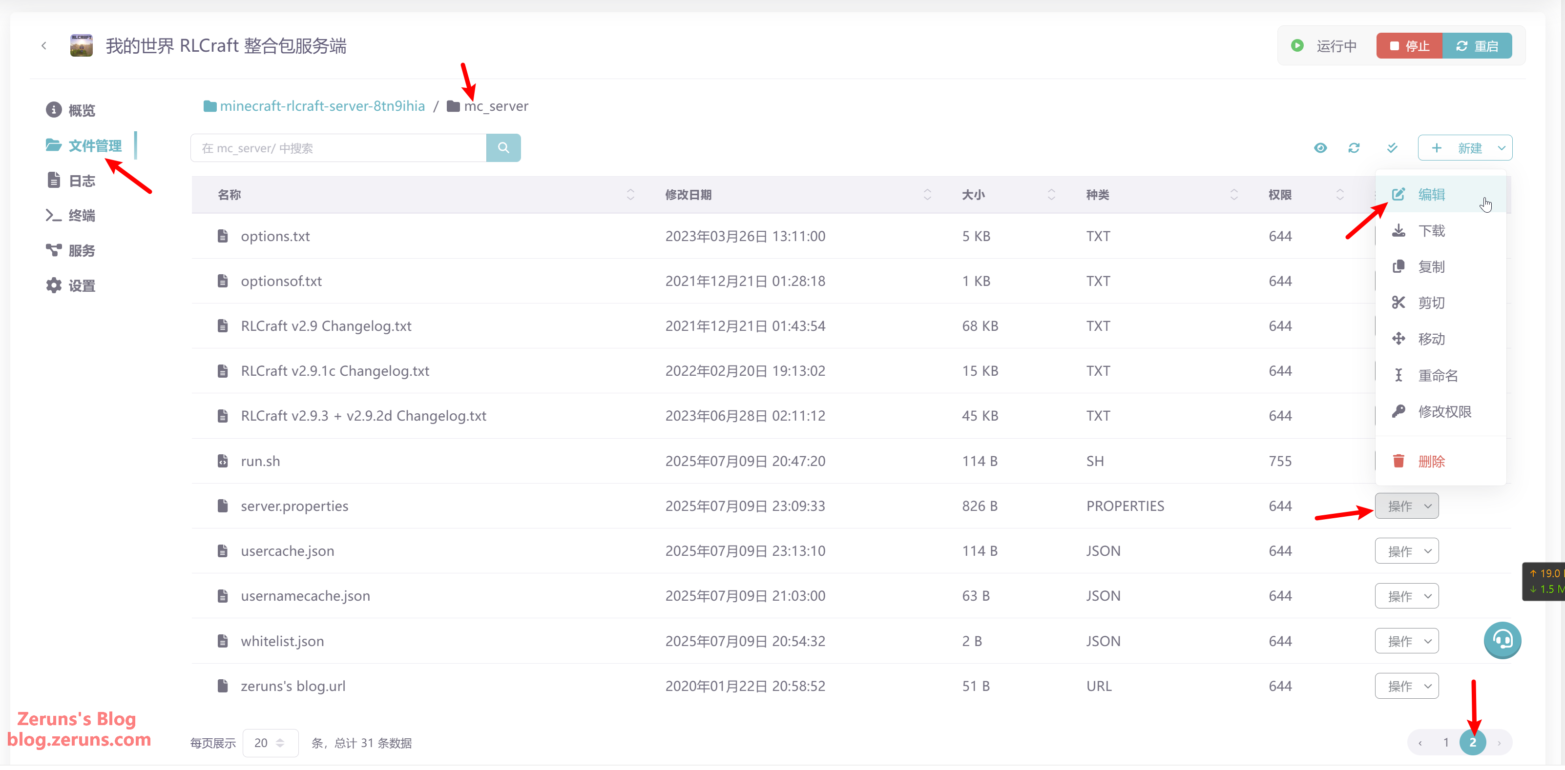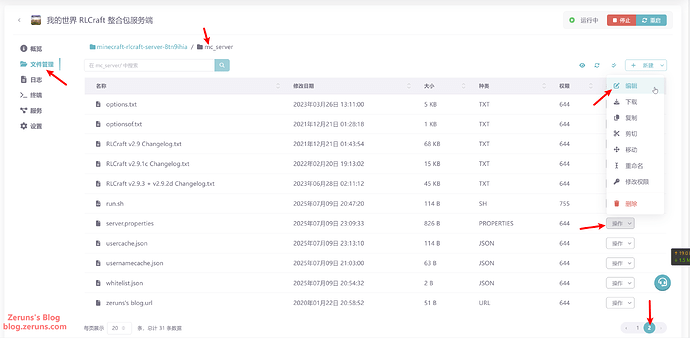 在应用管理里的文件管理里进入mc_server目录,找到**server.properties文件**,点击右边的操作→编辑
