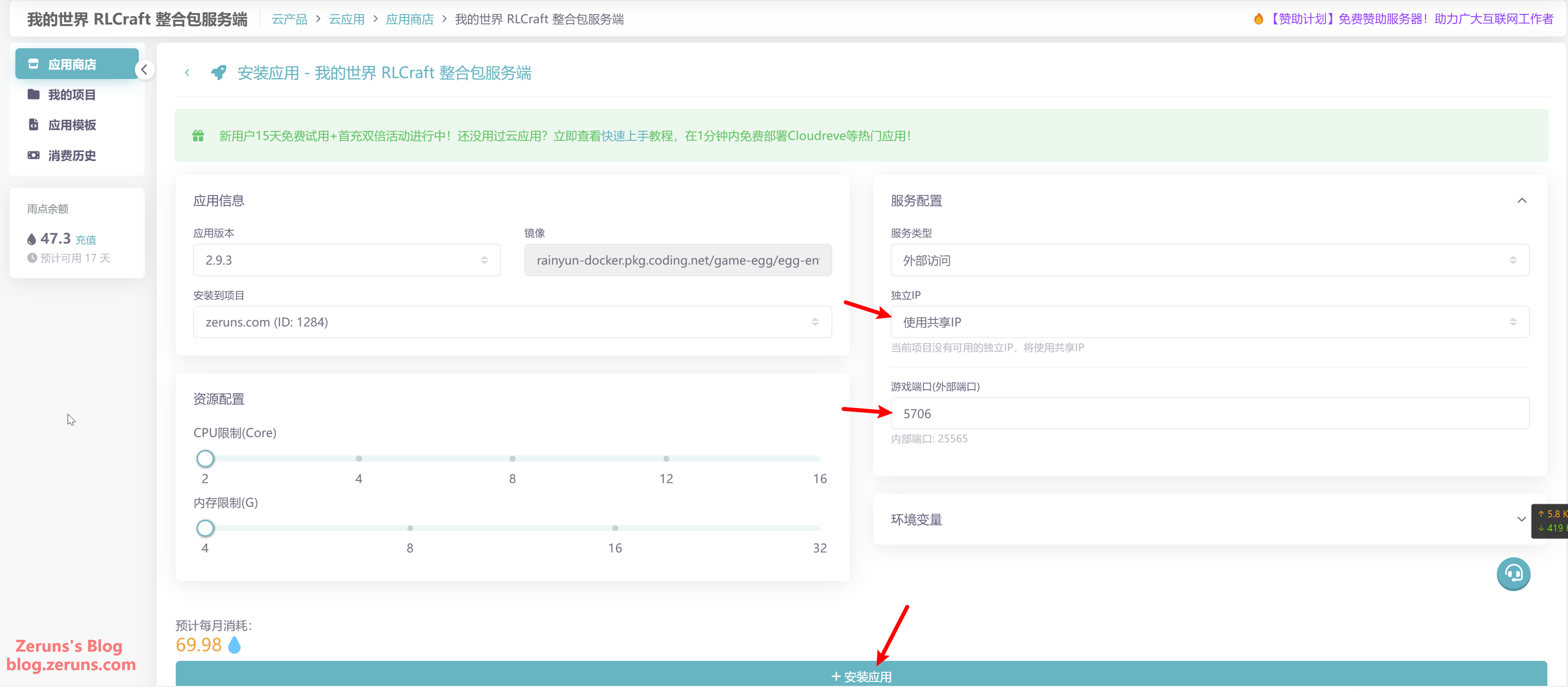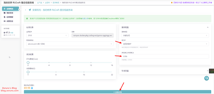 资源配置建议选2核4G以上,如果10个人以上同时在线玩的建议选4核8G,你也可以先开个低配,后面不够了也可以直接升级,一般选使用共享IP就够用了,服务端默认端口是25565,但共享IP的这个端口一般会被人用了,就随便输入一个端口(一般会随机生成),我这里是5706,如果你购买了独立IP那你可以直接用25565,最后点击安装应用。