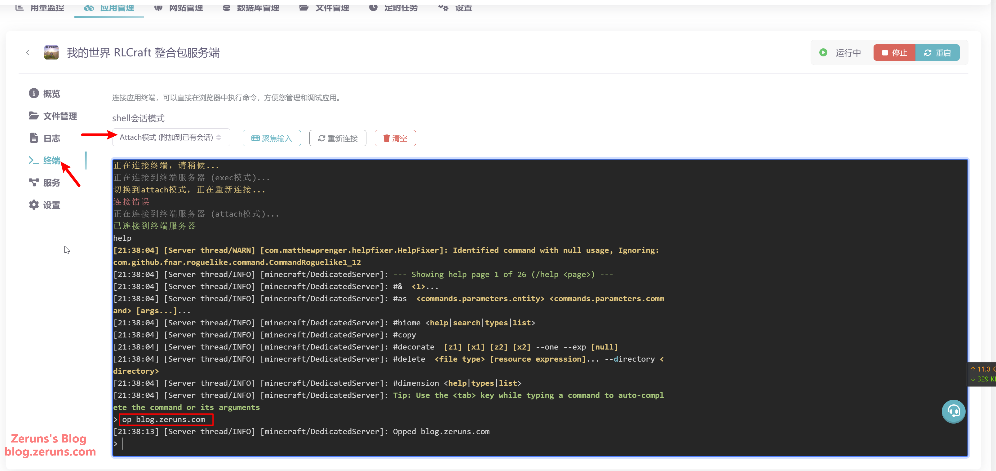 在应用管理里的终端里选择Attach模式(附加到已有会话),然后在下面黑色框里输入指令并回车就行,比如我要给我自己(用户ID:blog.zeruns.com)OP权限就输入 op blog.zeruns.com ,在这里输入指令无需加 / 。