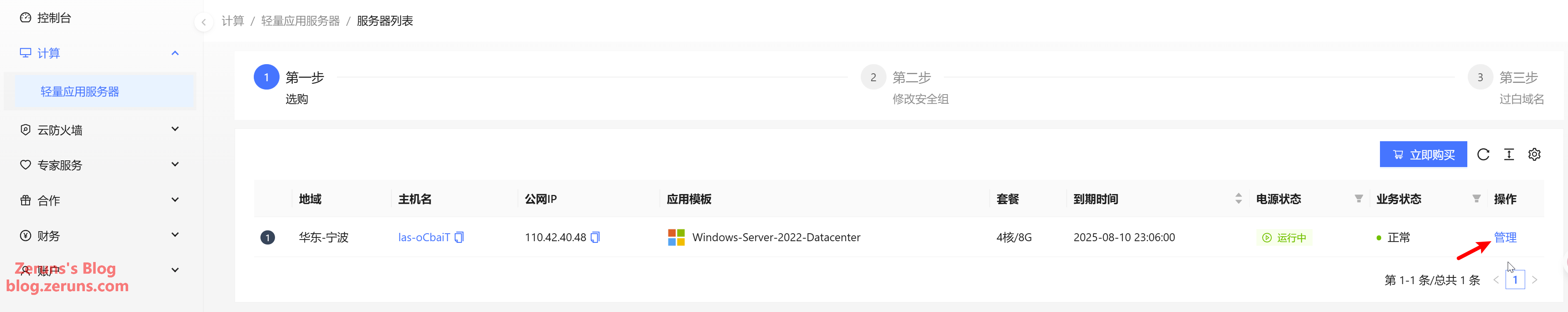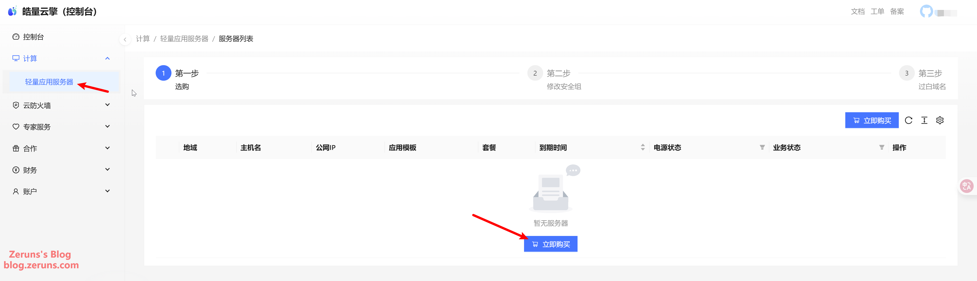 注册账号后进到控制台,点击 计算→轻量应用服务器→立即购买。