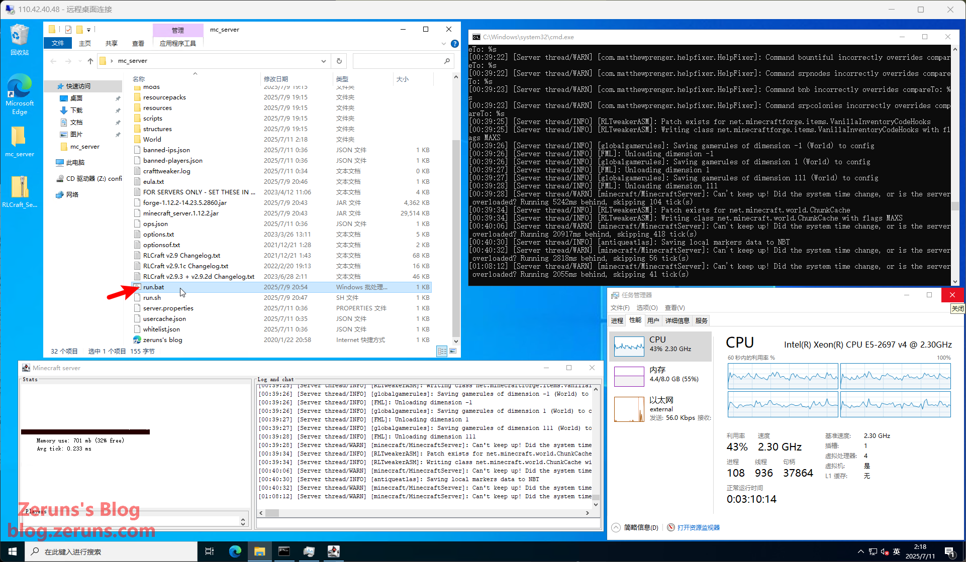 这个服务端压缩包里我已经放了Java8了,启动脚本 run.bat 也编写好了,直接双击打开 run.bat 就行,然后等待几分钟服务器就开启完成了。
