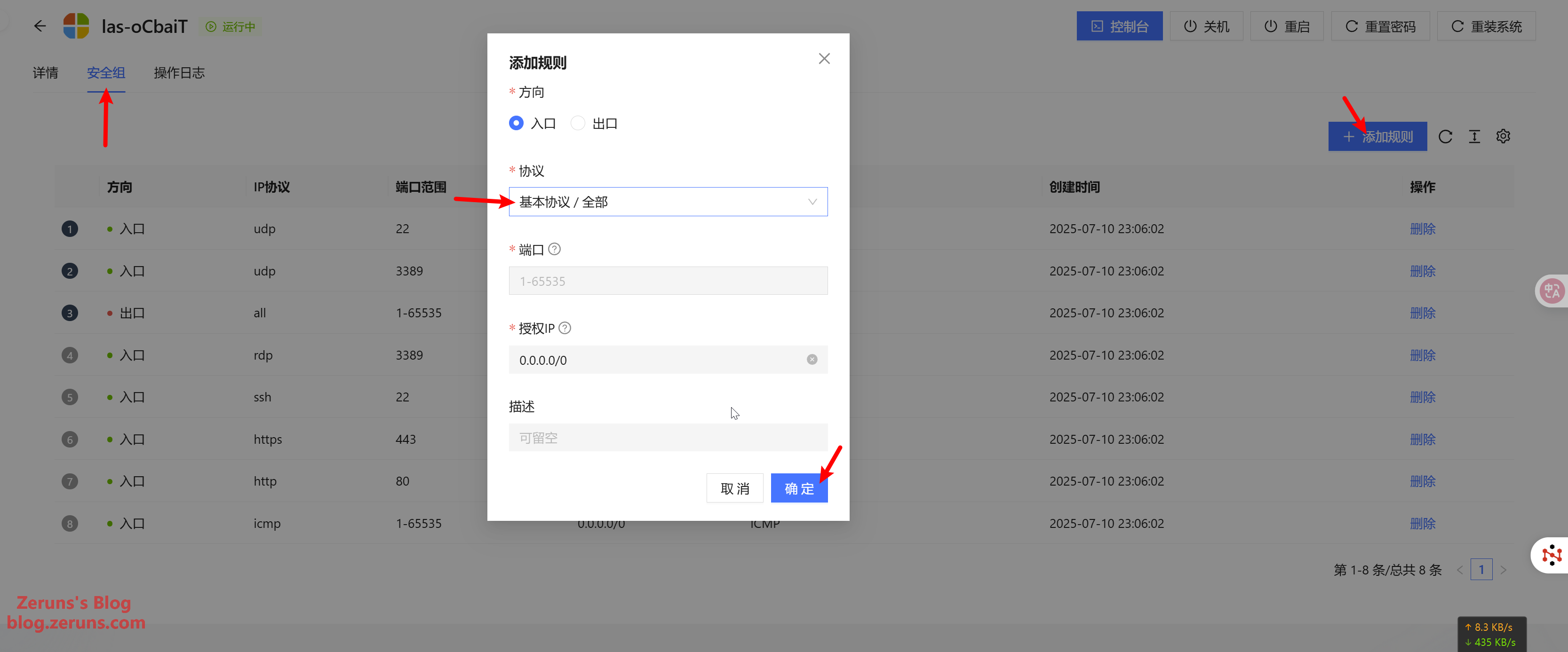 在服务器控制台点击安全组,点击添加规则,选择基本协议/全部,点击确定。