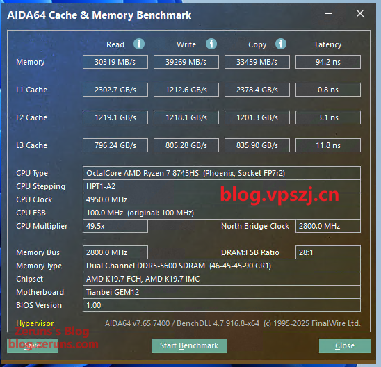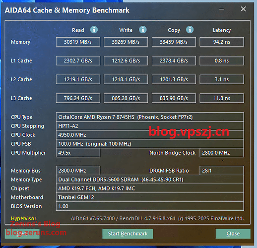 使用AIDA64的Cache&Memory测试工具测得,内存读取速率30.319GB/s,写入速率39.269MB/s,内存延迟94.2ns。
