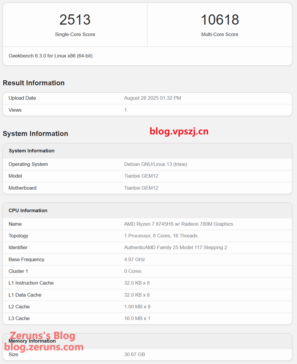 单核 2513 分,多核 10618 分(感觉分数有点问题,多核跑分偏低了)。