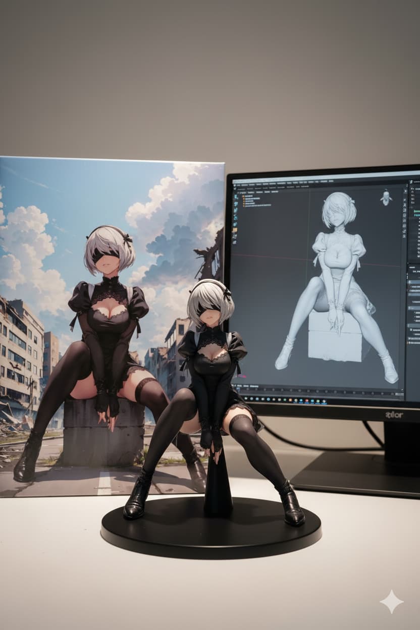 Create a photorealistic, highly detailed PVC character figure, meticulously crafted based on a photograph. The figure stands proudly on a sleek, round plastic base. Behind it, its collectible box features a high-quality print of the original character art. Adjacent to the box, a computer monitor displays the intricate 3D modeling process in Blender, showcasing the digital sculpting and texturing. The entire figure is rendered in a clear, translucent PVC material, giving it an ethereal, ghost-like quality. The scene is set within a professional design studio with soft, diffused indoor lighting that highlights the figure’s form and transparency.