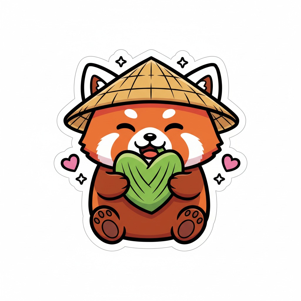 A kawaii-style sticker of a happy red panda wearing a tiny bamboo hat. It’s munching on a green bamboo leaf. The design features bold, clean outlines, simple cel-shading, and a vibrant color palette. The background must be white