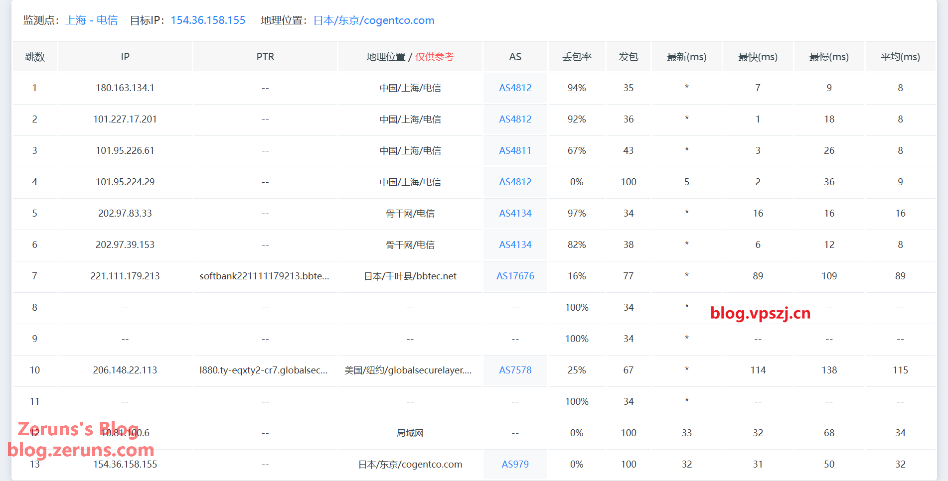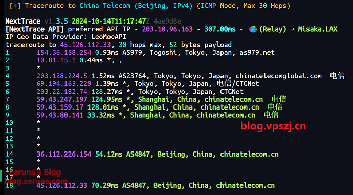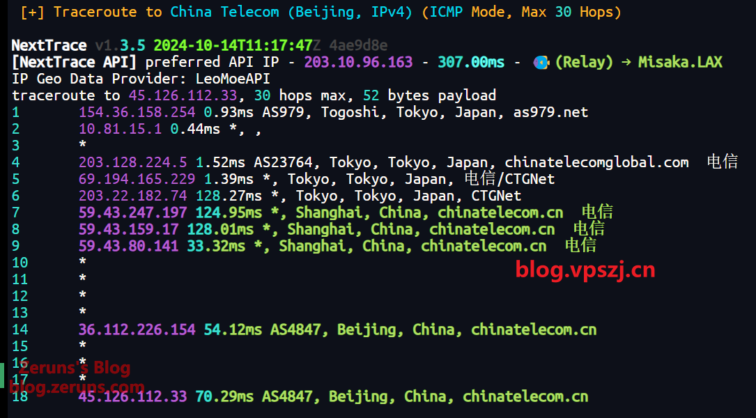 回程到北京电信,走电信CTGNet线路(AS23764)到上海再到北京。