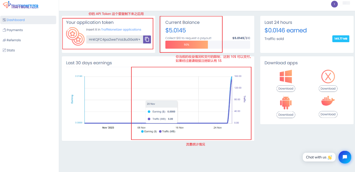 经过一段时间等待小鸡上线,然后再回到后台 Traffmonetizer 就可以查看自己的收益了。祝你好运!