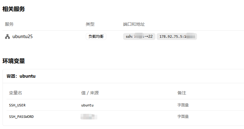 创建一个负载均衡的服务,将ssh的22端口映射出去,这样就等到了一台vps。使用系统分配的ip:port 和你上方设置的环境变量中的用户名 ubuntu 和密码 ubuntu!23 就可以登录vps了。