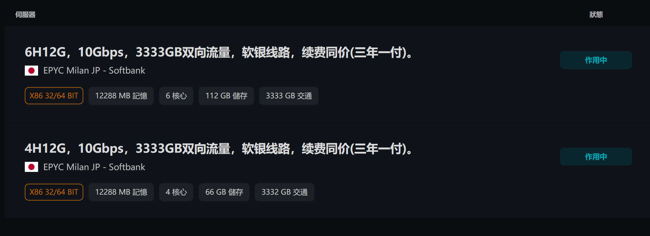 4H12G和6H12G服务器都是日本IP,软银线路,10Gbps端口,3333GB双向流量。