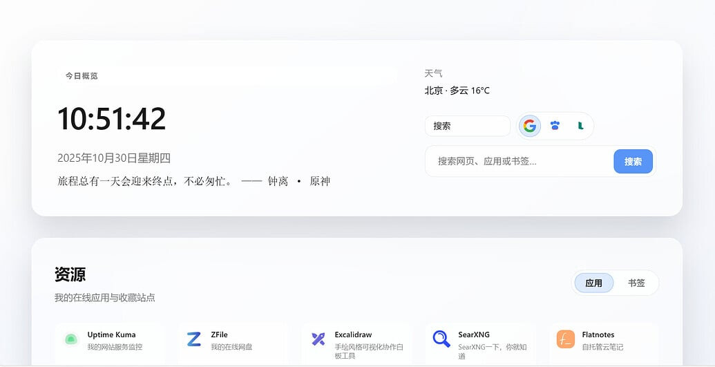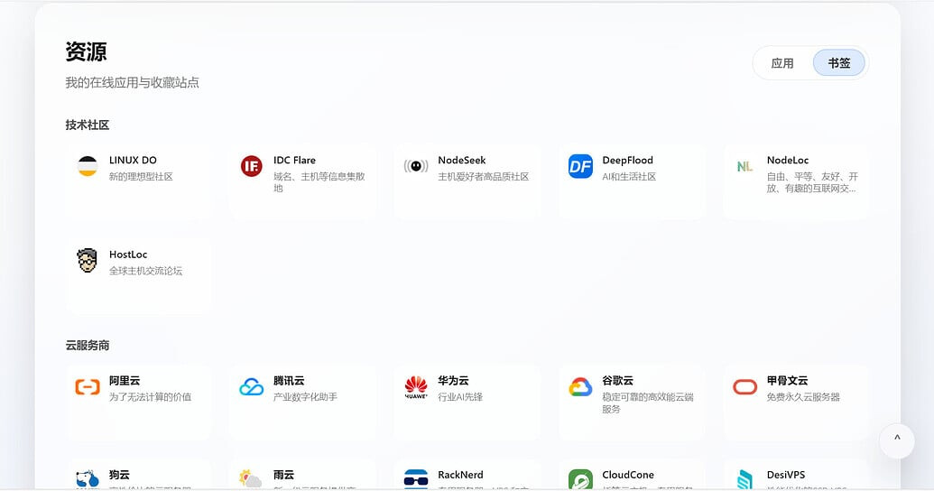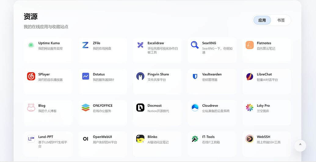 - 应用与书签分区:两大模块采用自适应 4-5 列网格排布,支持自由缩放,卡片包含图标、名称与描述信息。