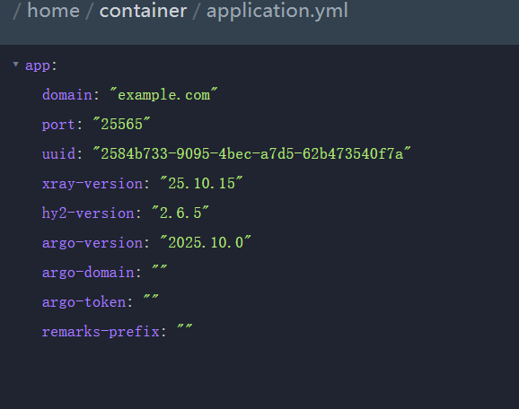 - 修改配置参数,来到控制台页面点击右边的Address复制IP和端口,回答文件点击application.yml,将第一行的域名和端口替换掉。注意域名后的冒号要去掉,uuid可自行删掉让它自动生成,默认的xrary、hy2、argo版本可自行选择保留或删除,临时隧道也一样或者固定隧道。