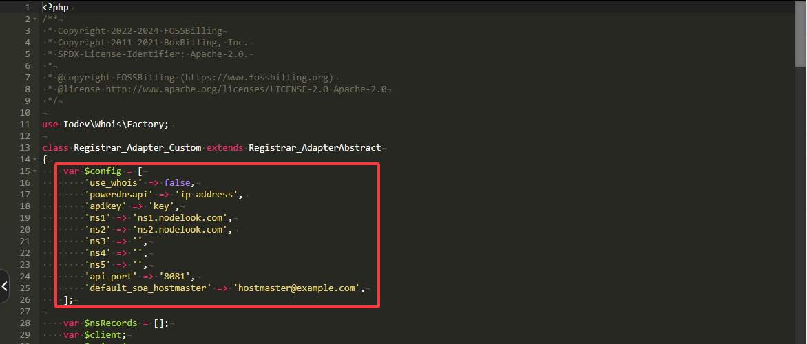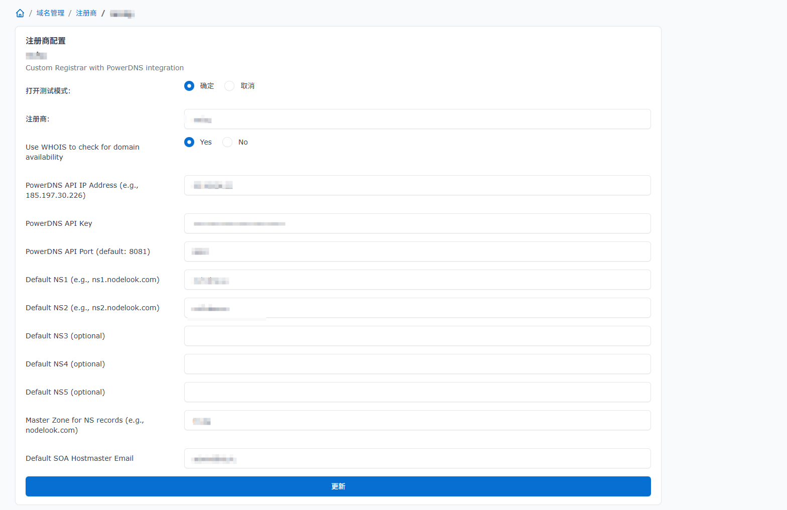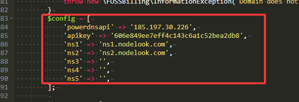 $config = [ 'powerdnsapi' => '自己的', 'apikey' => '自己的', 'ns1' => 'ns1.自己的', 'ns2' => 'ns2.自己的', 'ns3' => '', 'ns4' => '', 'ns5' => '', ];