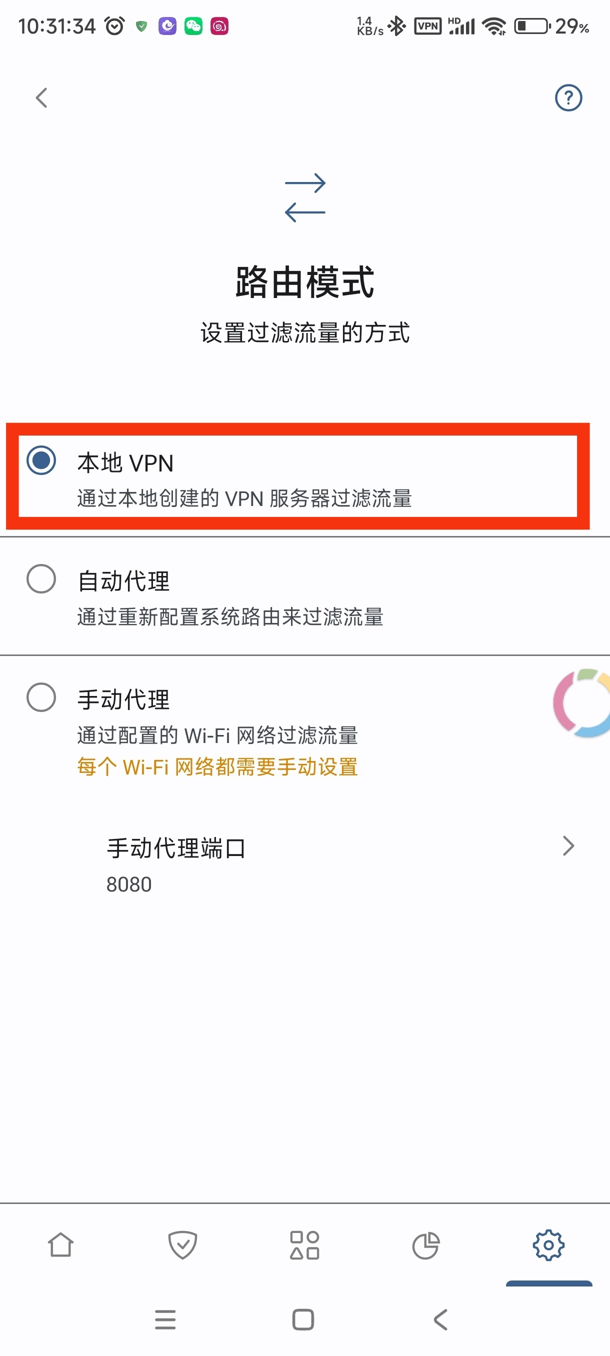 进入 AdGuard 的 设置 - 过滤 - 网络 - 路由模式,确保它处于默认的 本地 VPN 状态。