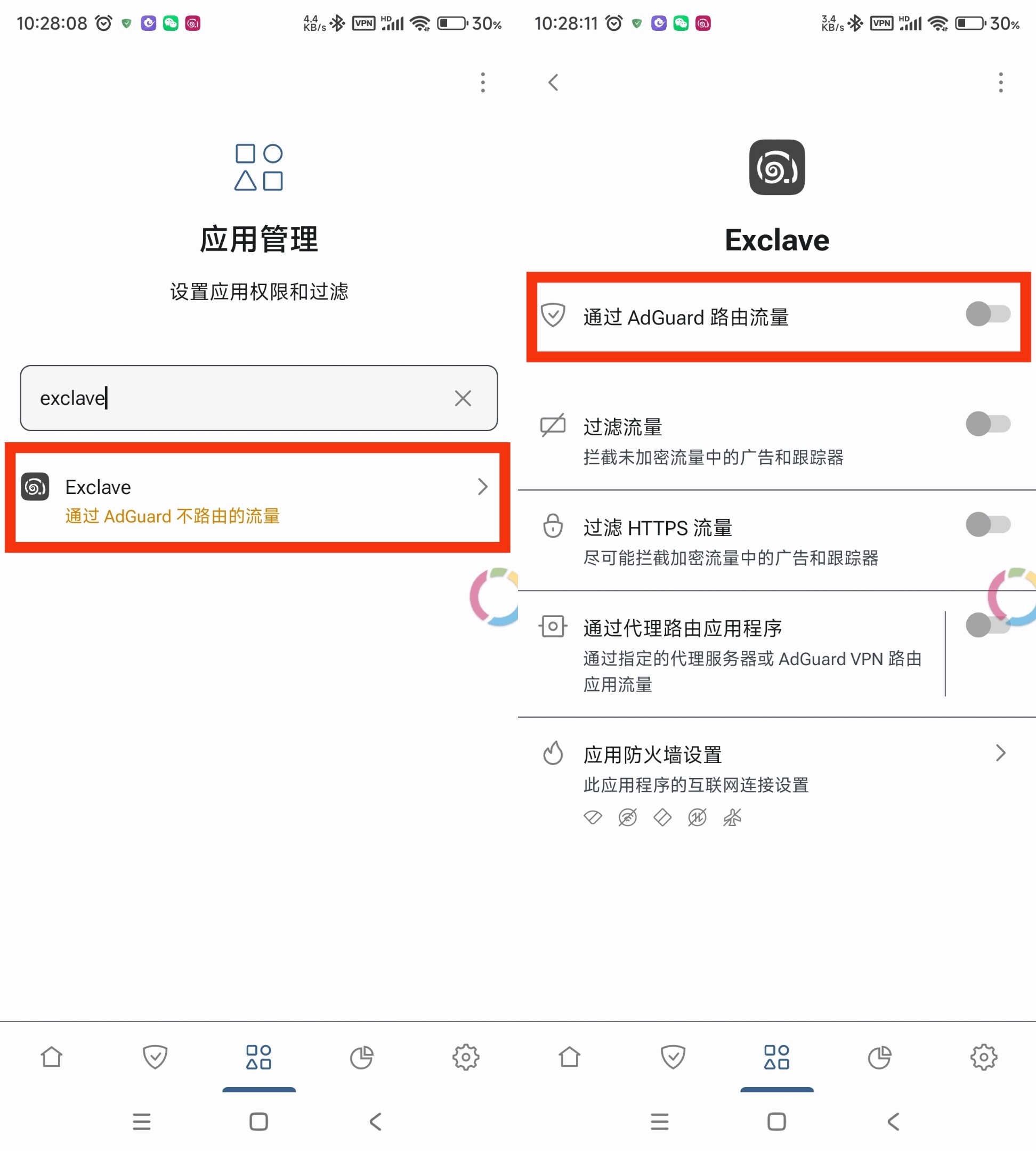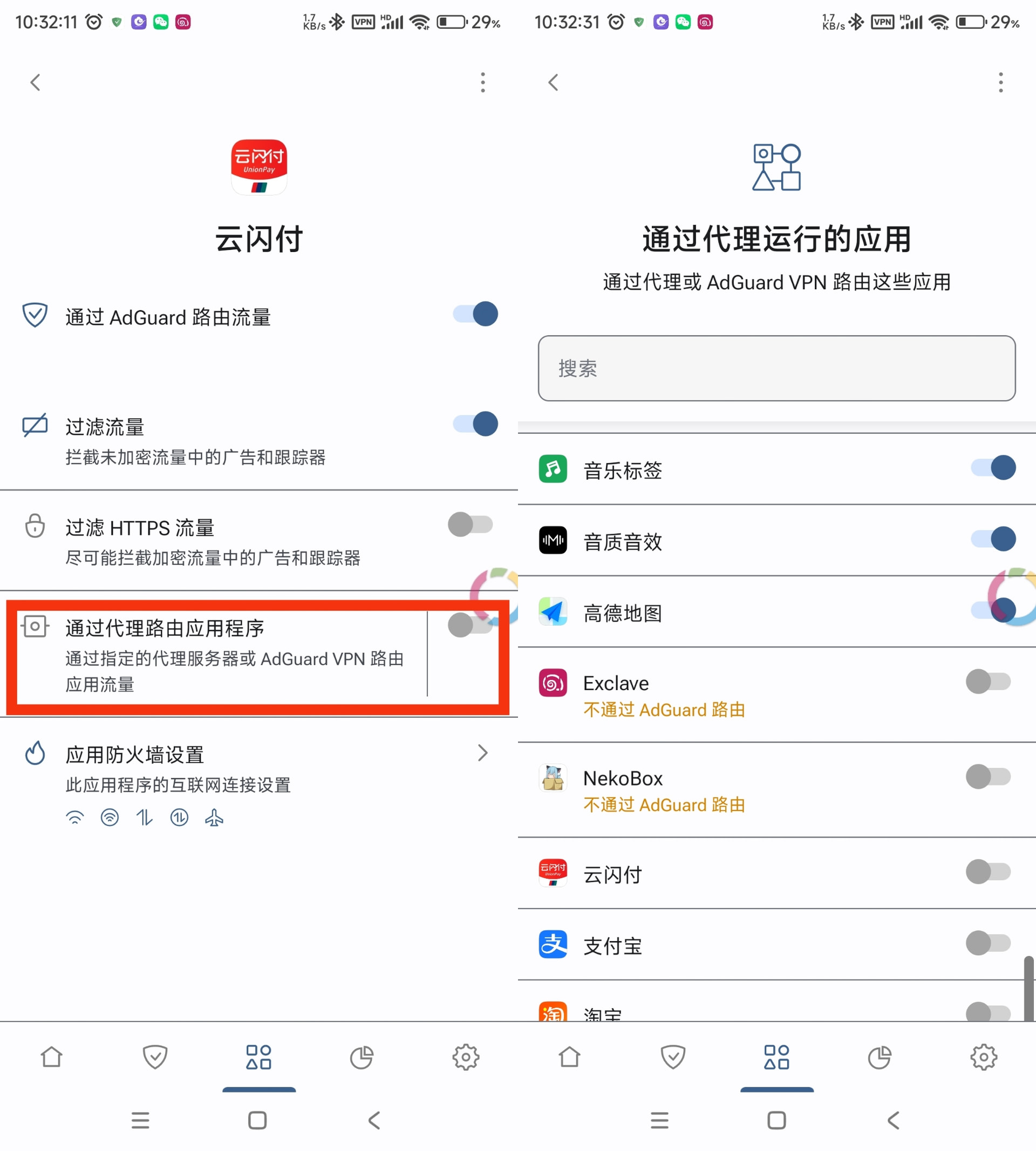 解决方法是在 AdGuard 中进行分应用代理设置。打开 AdGuard,进入 应用管理,找到需要设置的软件,切换 通过代理路由应用程序 即可。你也可以进入 AdGuard 的 设置 - 过滤 - 网络 - 代理,在 通过代理运行的应用 中进行批量设置。