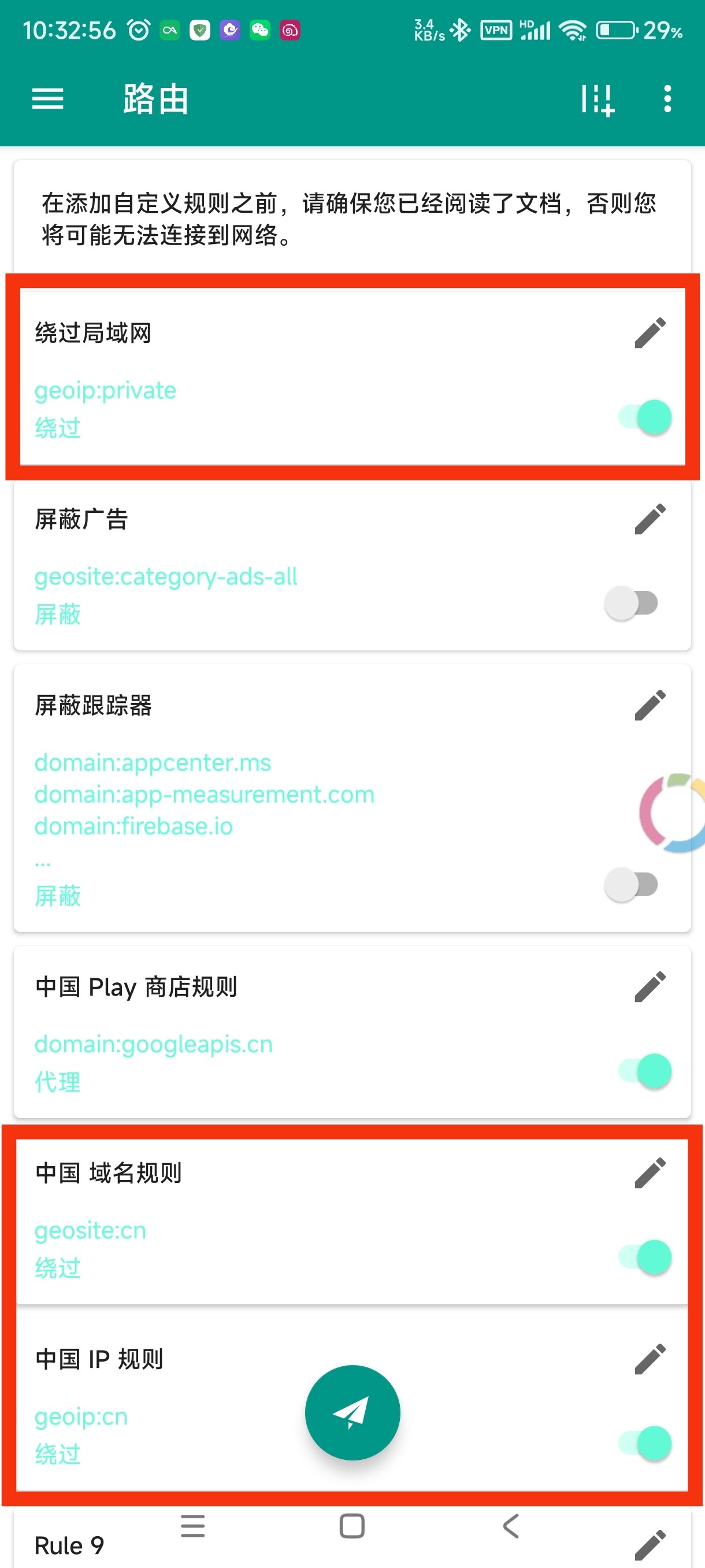 其实,与其依赖分应用代理,更推荐在代理软件中配置基于域名(geosite)和 IP(geoip)的路由规则。这种方式更灵活、更强大,不受系统 VPN 服务归属的影响。