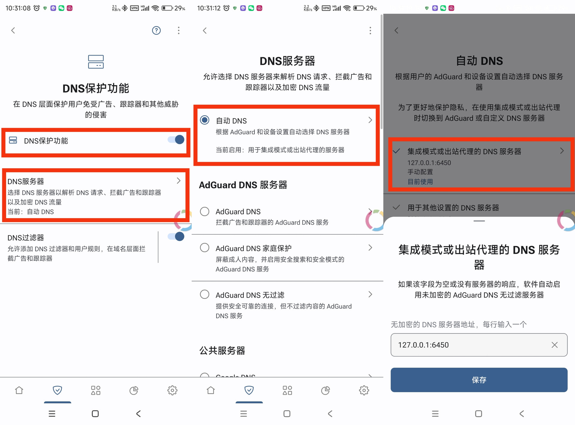 提示:新版 AdGuard 的 防护 在底部导航栏的第二个图标。旧版 AdGuard 没有自动 DNS 功能,你需要在侧滑栏中点击 设置 - DNS - 选择DNS服务器,添加自定义DNS服务器,在 服务器地址 中填入 127.0.0.1: 加上你在第二步记下的本地 DNS 端口。