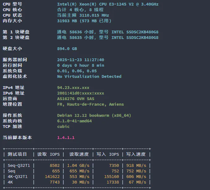内存中奖、带核显的法国SSD硬盘物理服务器!