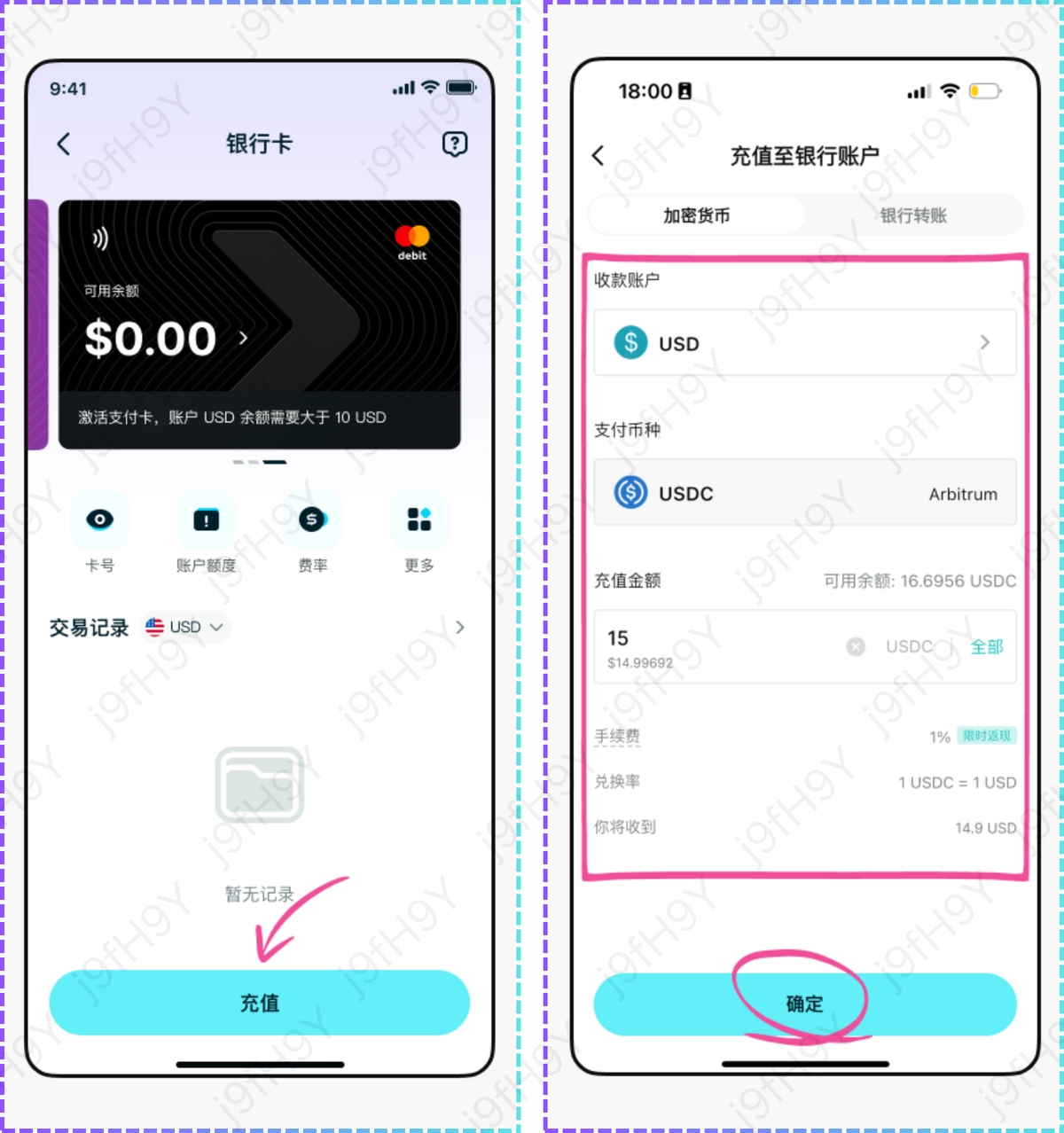 打开银行卡,点击“充值”,建议充值金额填写为 11 USDC,一路点击“确认”即可完成充值。