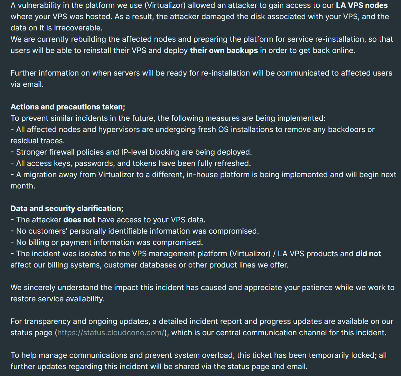 为了保持透明和持续更新,详细的事故报告和进展更新可在我们的状态页面(https://status.cloudcone.com/)获